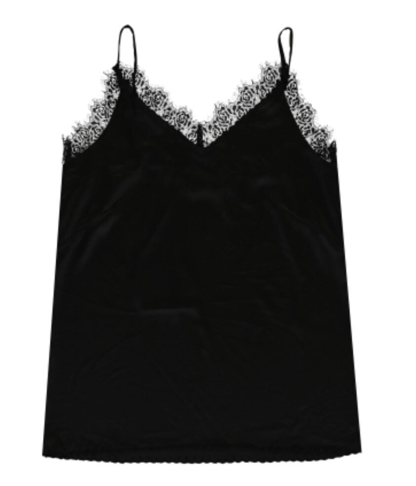 Top Sasie, een zwarte top met smalle bandjes met een klein kantje