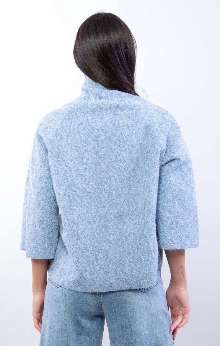 Wij vallende blazer in bouclé in de kleur blauw! De blazer heeft een wijder vallende driekwart mouw
