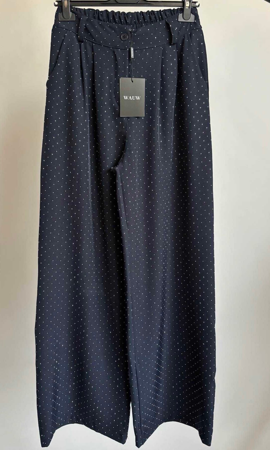 Prachtige pantalon Dori! Deze pantalon is donkerblauw en is een wijder vallend model. De pantalon heeft all over Strass steentjes